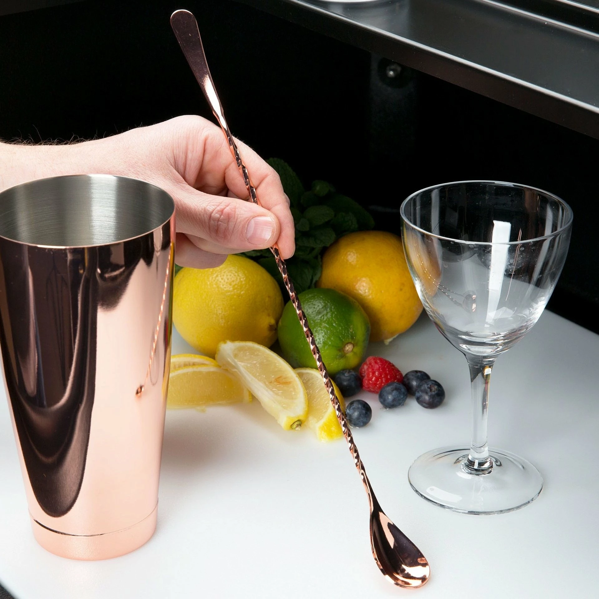 Whether its classics like Old Fashioneds, whiskey sours or martinis or something a bit more trendy ย – think pumpkin spice Moscow Mules โ mixing drinks for your cocktail-loving friends starts with reaching for professional-quality bar tools from Barfly Mixology Gear by Mercer. Show your deft hand at smoothly mixing cocktails made to order or by the pitcher with the Mercer Barfly 13.2โ Copper-Plated Japanese-Style Bar Spoon M37010CP. Barflyโs handsome bar spoon is made of a single piece of Copper-plated stainless steel that wonโt absorb stains or odors that could cloud the taste of fine spirits. This dual-use bar utensil has a precision-molded spoon on one end for accurate measuring, precise pouring, and gentle stirring; the other end is a slightly concave โJapanese Styleโ machined edge to expertly transport and mix small quantities of garnishes and ingredients. The elegant spiraled handle is designed with a twist to gently blend without bruising, and at a stately 13.2โ long, itโs perfect for tall drink glasses and pitchers. With such alluring looks and expert performance, Barfly Mixology Gear by Mercer can turn your kitchen into the neighborhoodโs trendiest cocktail lounge.