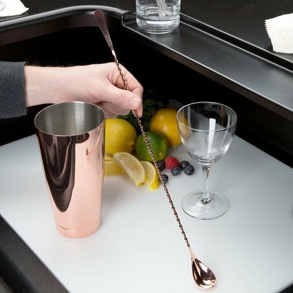 Whether its classics like Old Fashioneds, whiskey sours or martinis or something a bit more trendy ย – think pumpkin spice Moscow Mules โ mixing drinks for your cocktail-loving friends starts with reaching for professional-quality bar tools from Barfly Mixology Gear by Mercer. Show your deft hand at smoothly mixing cocktails made to order or by the pitcher with the Mercer Barfly 17.1โ Copper-Plated Japanese-Style Bar Spoon M37011CP. Barflyโs handsome bar spoon is made of a single piece of copper-plated stainless steel that wonโt absorb stains or odors that could cloud the taste of fine spirits. This dual-use bar utensil has a precision-molded spoon on one end for accurate measuring, precise pouring, and gentle stirring; the other end is a slightly concave โJapanese Styleโ machined edge to expertly transport and mix small quantities of garnishes and ingredients. The elegant spiraled handle is designed with a twist to gently blend without bruising, and at a statuesque 17.1โ long, itโs perfect for tall drink glasses and pitchers. With such alluring looks and expert performance, Barfly Mixology Gear by Mercer can turn your kitchen into the neighborhoodโs trendiest cocktail lounge.