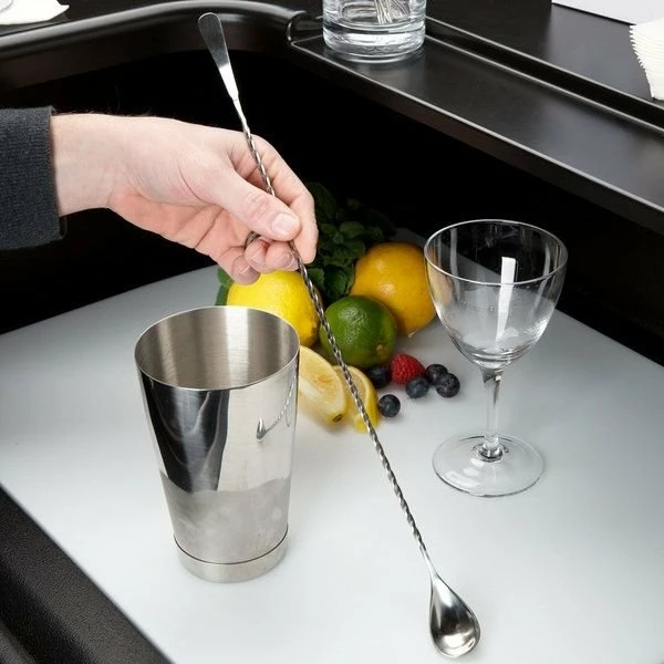 Whether its classics like Old Fashioneds, whiskey sours or martinis or something a bit more trendy ย – think pumpkin spice Moscow Mules โ mixing drinks for your cocktail-loving friends starts with reaching for professional-quality bar tools from Barfly Mixology Gear by Mercer. Show your deft hand at smoothly mixing cocktails made to order or by the pitcher with the Mercer Barfly 17.1โ Stainless Steel Japanese-Style Bar Spoon M37011. Barflyโs handsome bar spoon is made of a single piece of stainless steel that wonโt absorb stains or odors that could cloud the taste of fine spirits. This dual-use bar utensil has a precision-molded spoon on one end for accurate measuring, precise pouring, and gentle stirring; the other end is a slightly concave โJapanese Styleโ machined edge to expertly transport and mix small quantities of garnishes and ingredients. The elegant spiraled handle is designed with a twist to gently blend without bruising, and at a stately 17.1โ long, itโs perfect for tall drink glasses and pitchers. With such alluring looks and expert performance, Barfly Mixology Gear by Mercer can turn your kitchen into the neighborhoodโs trendiest cocktail lounge.