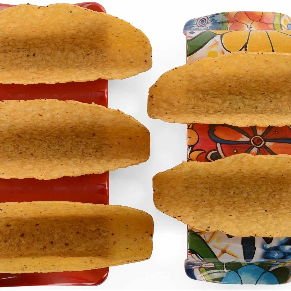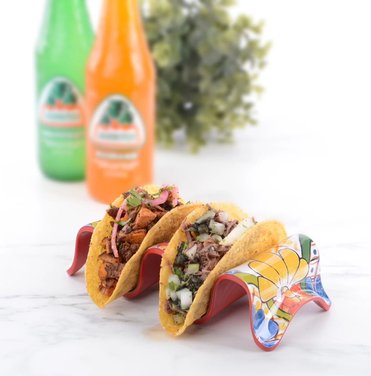 With the Prepara Multi-Taco Holder, filling & enjoying your favorite tacos has never been easier (or cleaner)! This handy holder keeps hard or soft taco shells upright and ready to layer with sour cream, meats, cheese, salsa, guacamole, and other delicious toppings. Once youโve filled your tacos, easily enjoy them throughout your meal without worry of them spilling or falling apart โ the taco holder will keep them sitting upright so contents stay in the taco and off the table. This taco holder is made of BPA-free melamine and features a beautiful glossy design thatโs crafted to look like ceramic for a durable & lovely piece thatโll add a fun fiesta touch to taco night! The reversible design can be used for holding two or three tacos at a time and is the perfect addition for build-your-own taco parties, taco Tuesdays, and more!