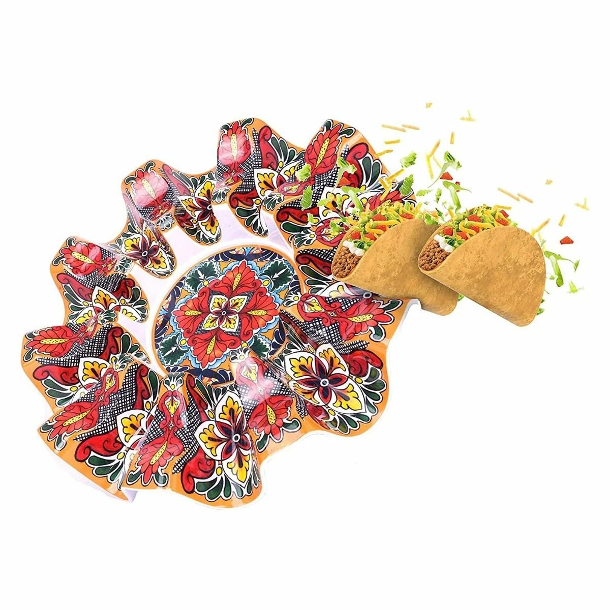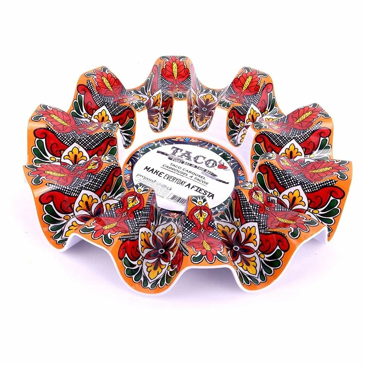 Let the fiesta begin with a table full of delicious tacos served with the Prepara Taco Carousel! Preparing and serving large batches of tacos is easy with this fun & festive carousel. Simply place your hard or soft taco shells in each of the dividers, fill them with your favorite meat, cheese, and toppings, and bring it to the table for guests to help themselves. The taco carousel can hold up to 10 tacos and keeps them sitting upright so contents stay in the taco and off the table. Itโs also designed with a center area that leaves room for a bowl of your favorite dip! This carousel is made of BPA-free melamine and features a beautiful design & glossy finish thatโs crafted to look like ceramic for a durable & stylish piece thatโs great for both casual & formal table settings. Plus, itโs dishwasher-safe for easy cleaning. Bring a festive flair to game day, taco Tuesday, or summer fiestas with the Prepara Taco Carousel!